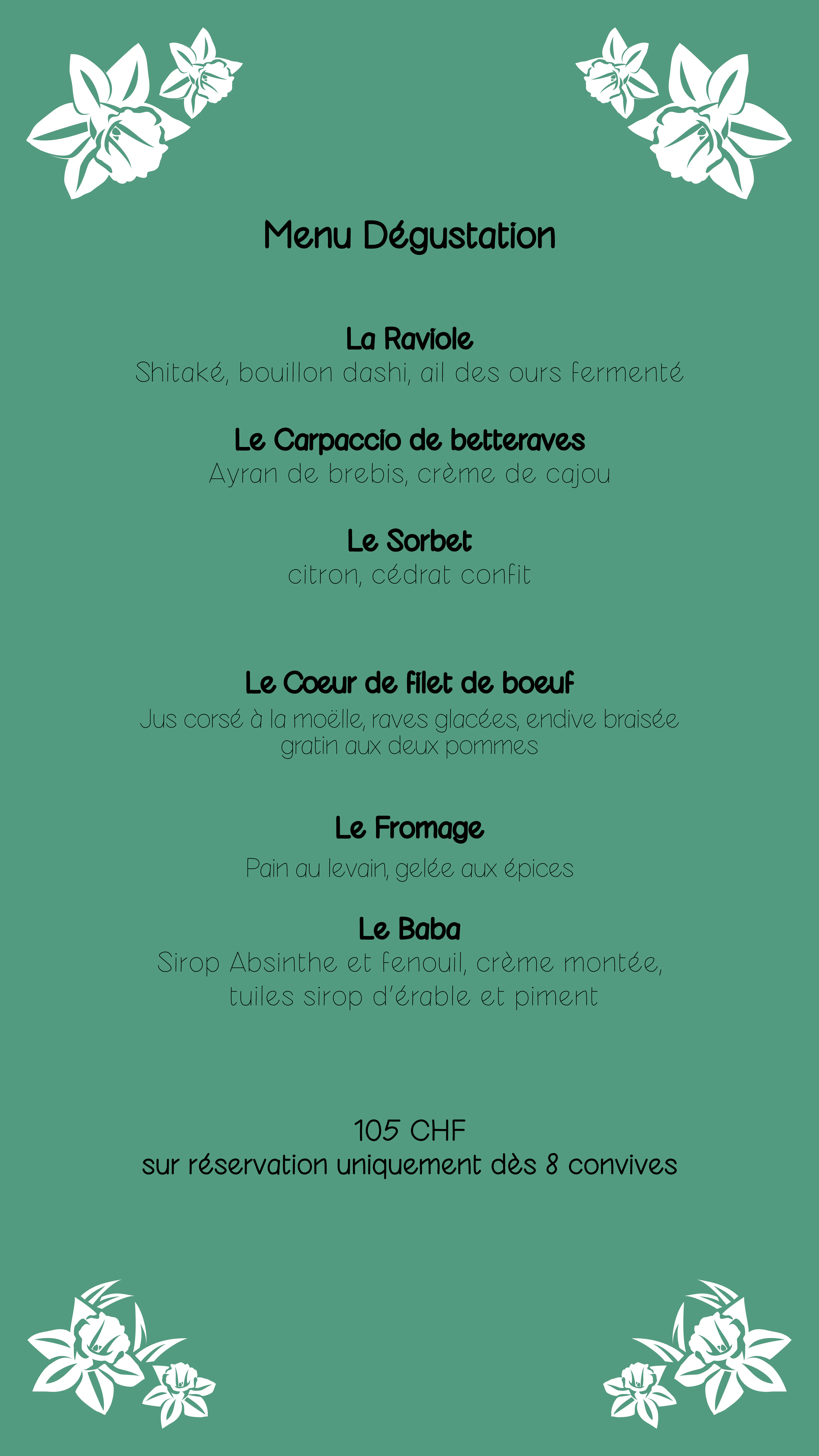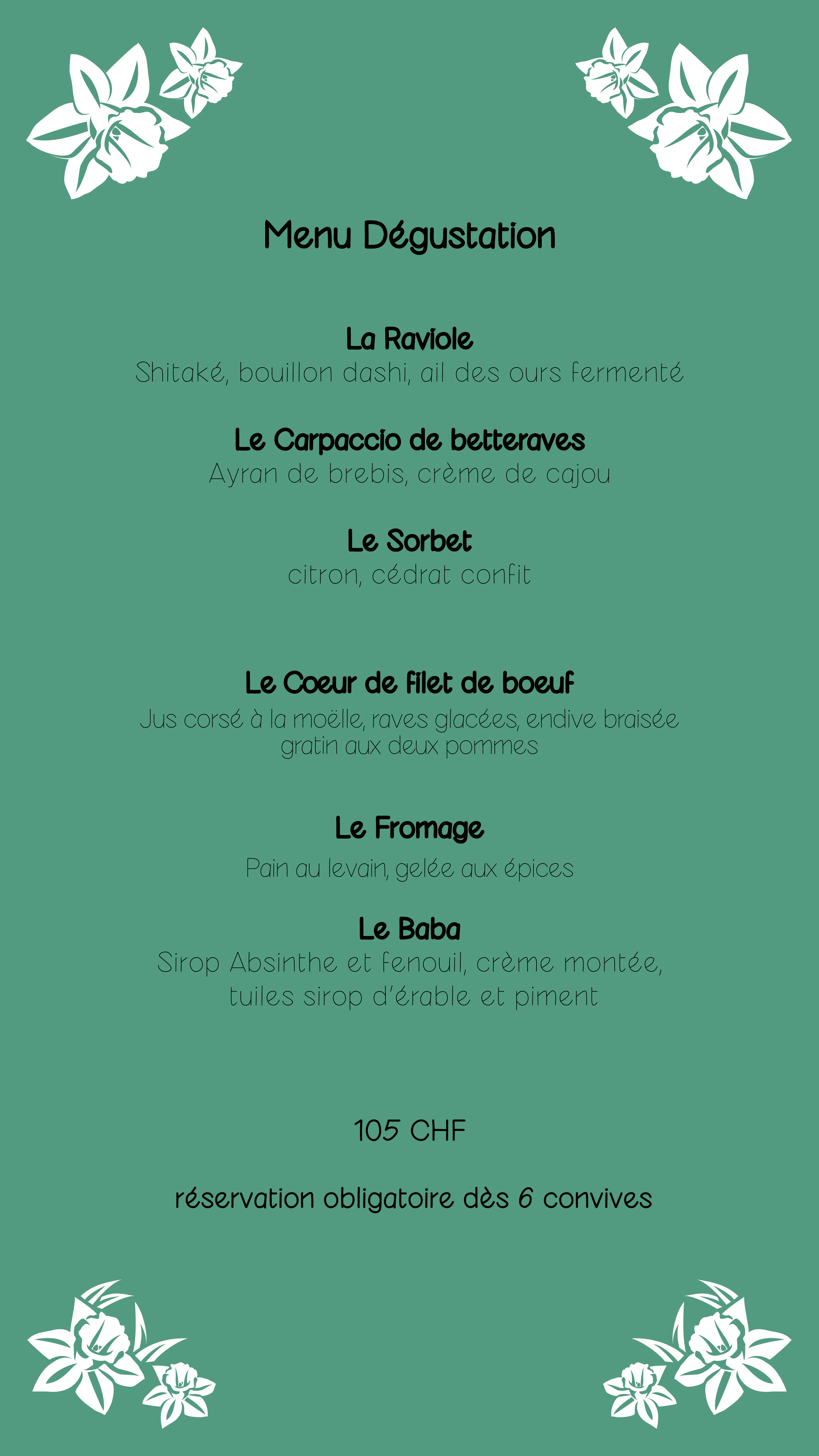 Pour les tablées nombreuses, nous devons, dès 11 convives, imposer un menu de groupe ou définir les choix de chacun.e en avance (jusqu'à 14 pers). Ceci permet d’assurer la qualité du service et de la cuisine.